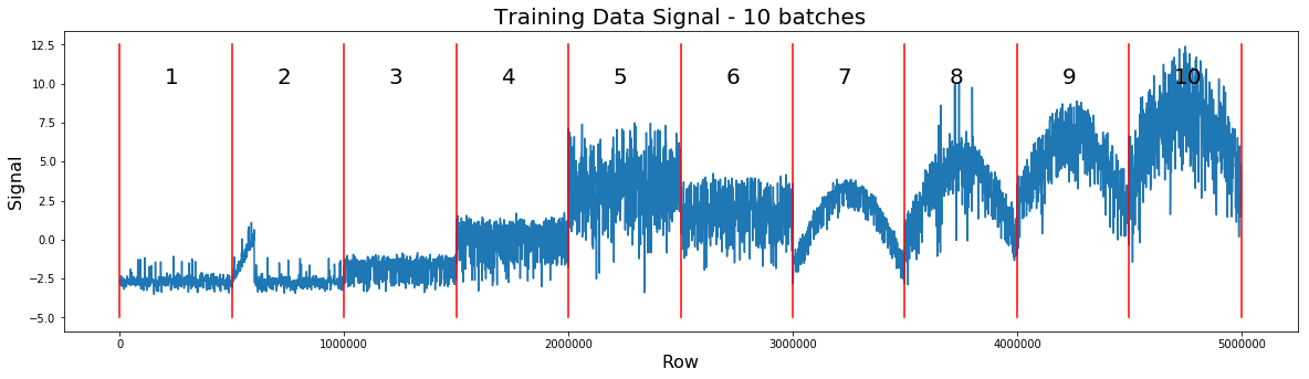 먼저 테스트 데이터에서 오픈 채널을 검사하여 데이터가 500K 측정 단위로 구성되어 있음을 알 수 있습니다. 전기 신호에서도 이러한 전이를 일괄 적으로 볼 수 있습니다. 테스트 세트에서 100K의 배치를 찾을 수 있습니다. 또한 트레인 세트에서 500K의 배치는 실제로 10 x 500K 배치로 구성됩니다.